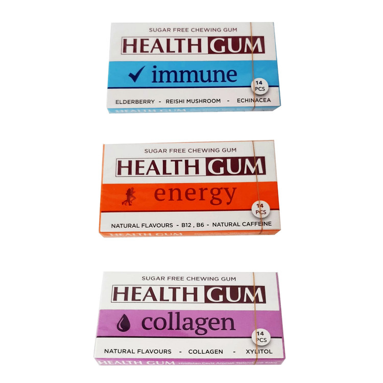 آدامس های Health Gum مدل کلاژن و ایمون، که بدون شکر هستند، حاوی ویتامین ها، زایلیتول و طعم دهنده های طبیعی هستند. این آدامس ها برای سلامتی لثه ها و تامین شادابی پوست مناسب هستند.